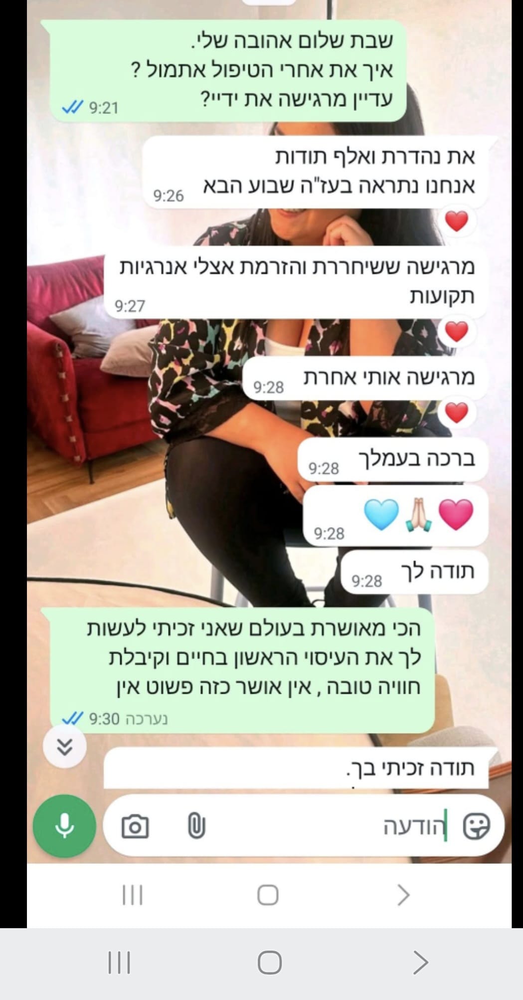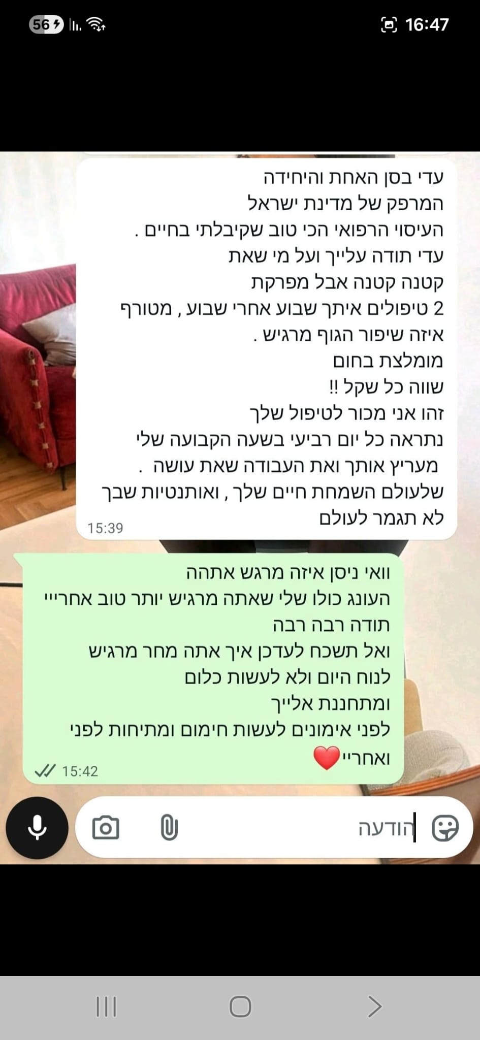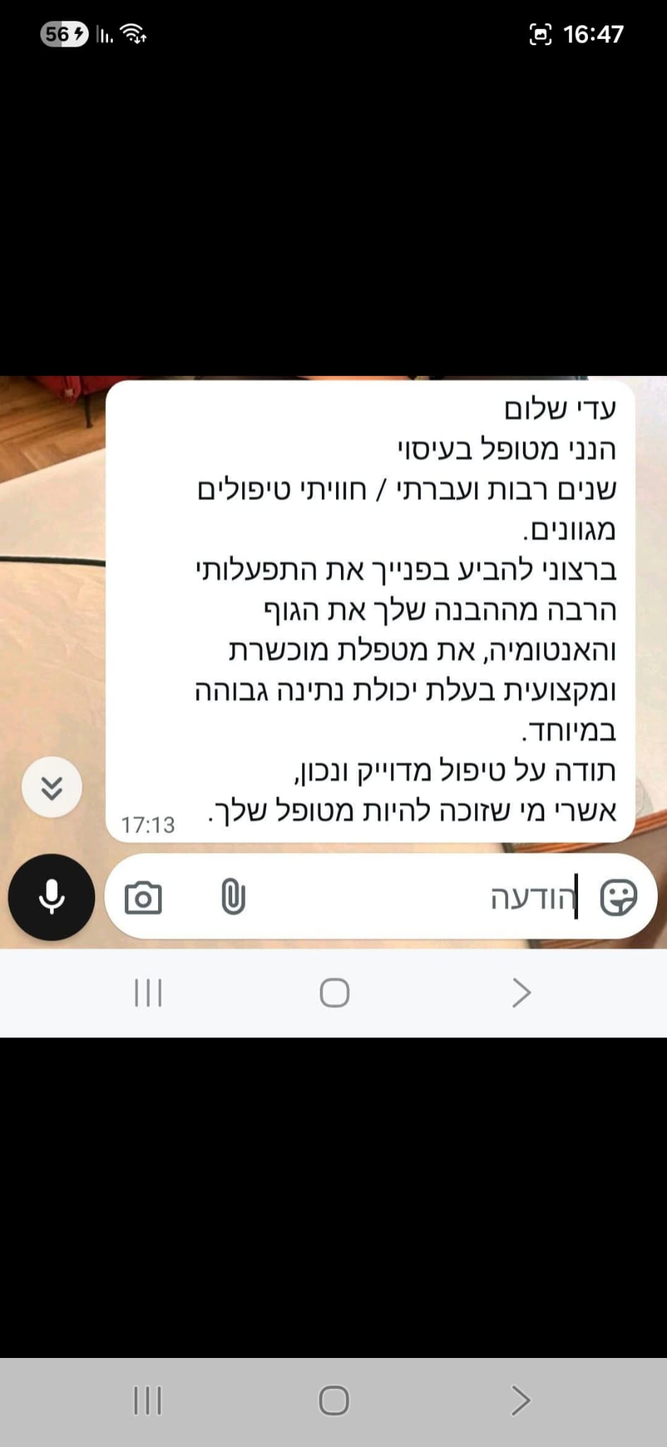 נובעת משילוב משולש של ידע רב, טכניקות מקצועיות ואהבה לעשייה, מה שמוביל למסע אמיתי לבריאות הגוף והנפש. אני מאמינה שכל טיפול הוא הזדמנות לחיבור עמוק יותר, הן פיזית והן רגשית. ראיית השינוי בעיני המטופלים, ההקלה שהם חווים והחיוך שחוזר לפניהם – הופכים כל טיפול לחוויה מרגשת ומשמעותית.