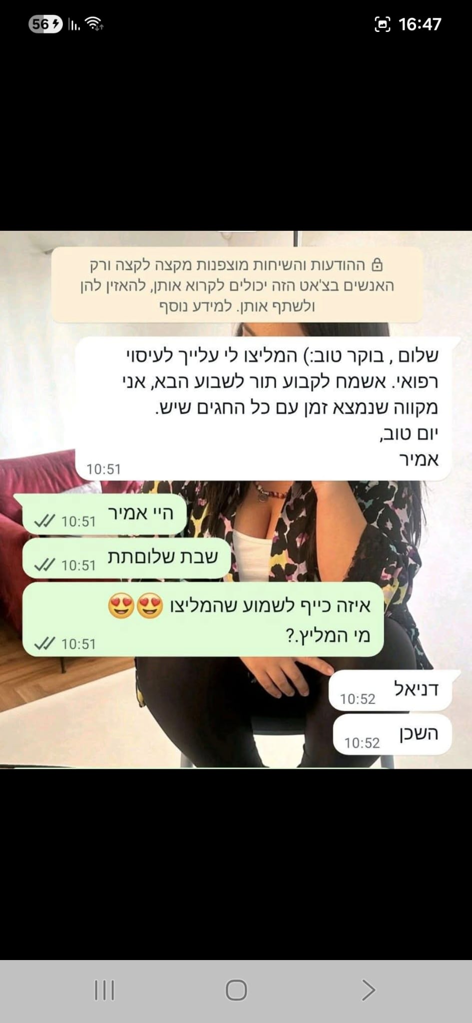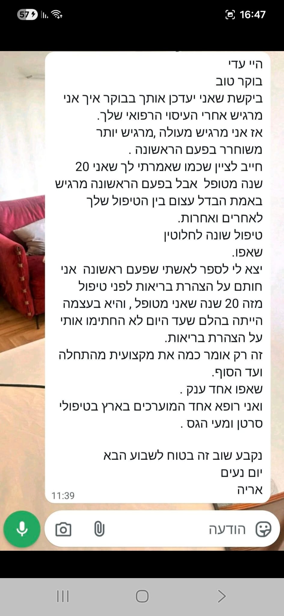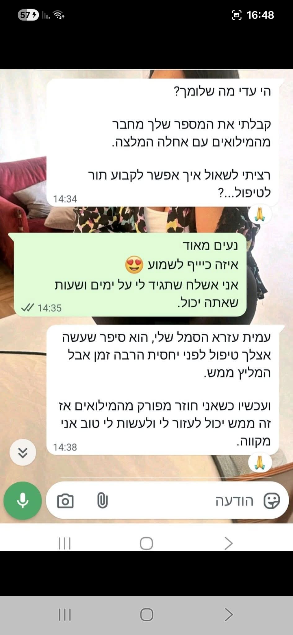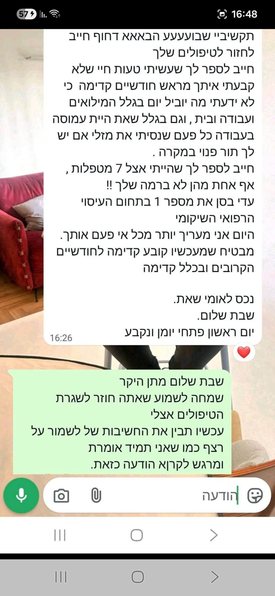 נובעת משילוב משולש של ידע רב, טכניקות מקצועיות ואהבה לעשייה, מה שמוביל למסע אמיתי לבריאות הגוף והנפש. אני מאמינה שכל טיפול הוא הזדמנות לחיבור עמוק יותר, הן פיזית והן רגשית. ראיית השינוי בעיני המטופלים, ההקלה שהם חווים והחיוך שחוזר לפניהם – הופכים כל טיפול לחוויה מרגשת ומשמעותית.