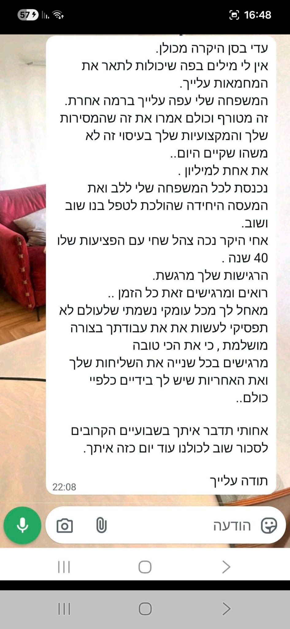 ערך מרכזי בחיי. היכולת להשפיע על הגורל שלי ולפעול לפי אמונותיי מעניקה לי לא רק חופש, אלא גם הבנה עמוקה של השפעת המקצוע שלי על האחרים. אהבתי לעיסוי ולמגע מחייבת אותי להיות נוכחת בכל רגע בהקשבה.