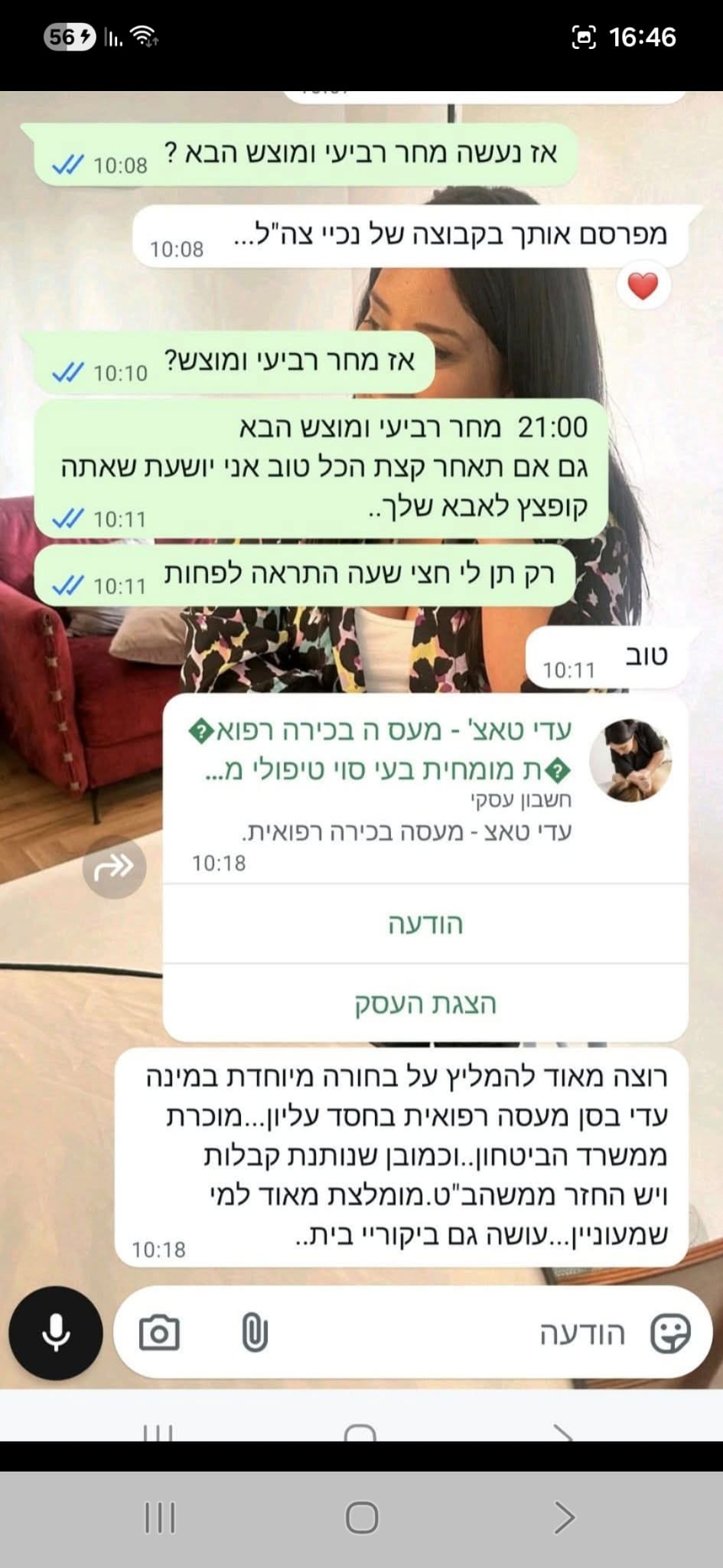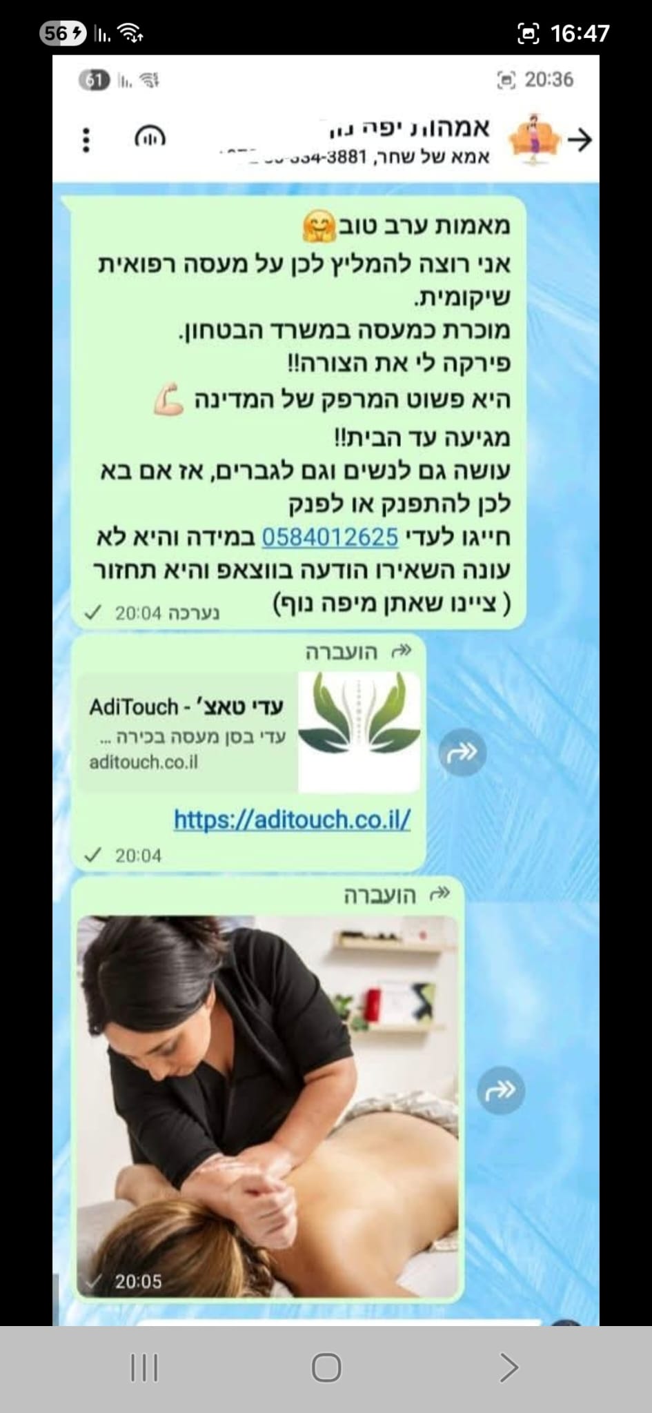 עדי טאצ' היא מעסה רפואית בכירה טיפולית שמאוהבת בעשייה שלה. אצלי בקליניקה הטיפול הגופני מתמזג עם הריפוי הנפשי לחוויה הוליסטית מרפאה ומחברת גוף ונפש. אני מומחית במגוון טכניקות עיסוי שונות כגון: רפואי טיפולי, שוודי, הוליסטי, לומי לומי, רקמות עמוק ועוד, אשר מותאמות אישית לצרכי כל מטופל ומטופלת.